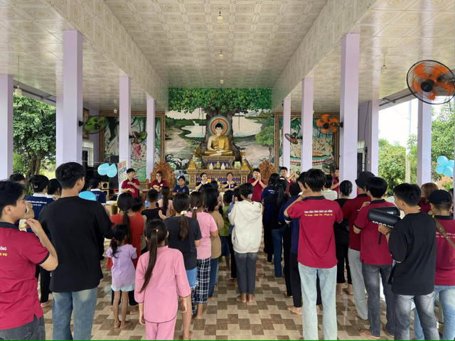 Giữa không gian “nhà Phật” với những bức tượng lớn nhỏ, các em thiếu nhi nhanh chóng hoà mình vào niềm vui của lễ hội. Tuy ban đầu có chút e ngại, song các bạn sinh viên Công giáo cùng nhắc nhau sống câu châm ngôn: “Nhiệt thành - Tin yêu - Bác ái” nhanh chóng xua tan cảm giác xa lạ và hết mình với các hoạt động văn nghệ, múa hát và trò chơi, lan tỏa tình thương và niềm vui. Có thể xua tan sự e dè, bởi từng người đều biết rõ câu châm ngôn đó học được nơi Đấng có “Lời ban sự sống”, để có thể kết nối và phá tan mọi khoảng cách.
