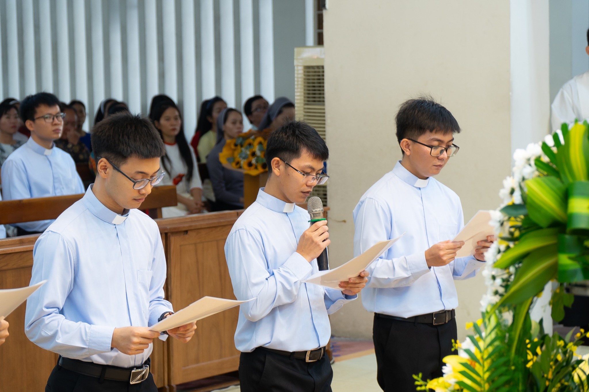Trước Chúa Giêsu Thánh Thể và trước sự chuyển cầu của triều thần Thiên Quốc cùng cộng đoàn, 12 thầy đã tuyên khấn trọn đời sống khó nghèo, khiết tịnh và vâng phục trong Dòng Tên.