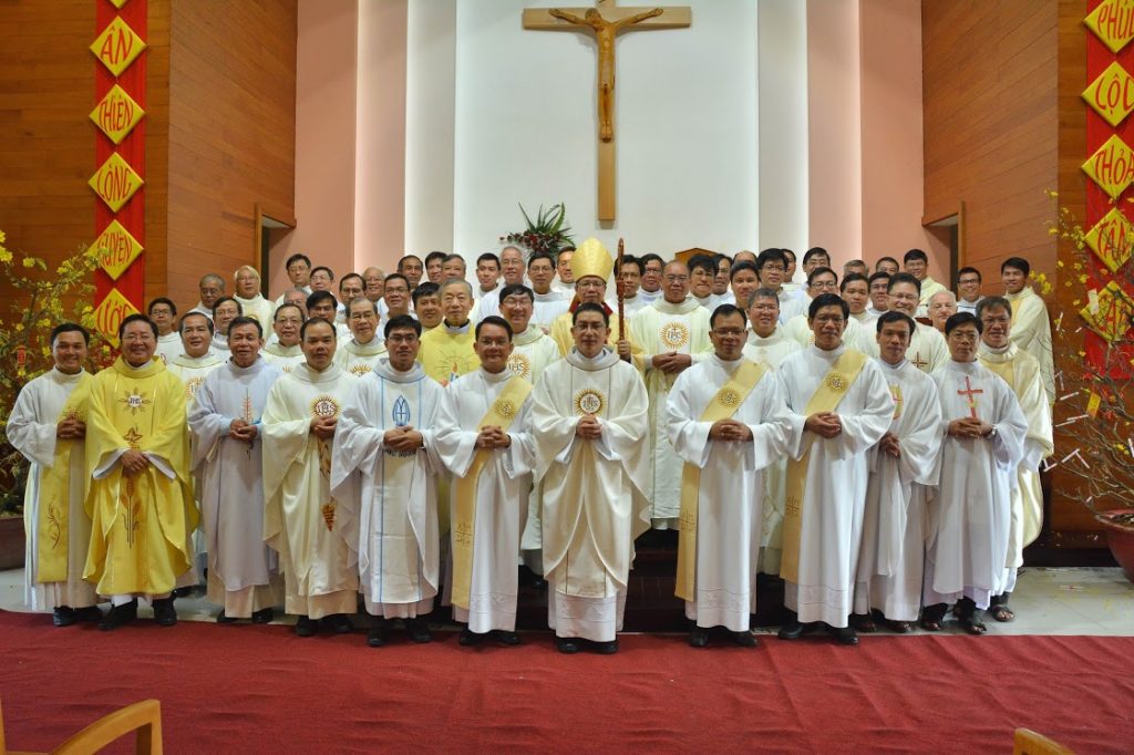 Bishop Joseph Do Manh Hung, posed with the newly-ordained deacons and priest after the mass and ordination rites at St Joseph Jesuit Scholasticate’s chapel.