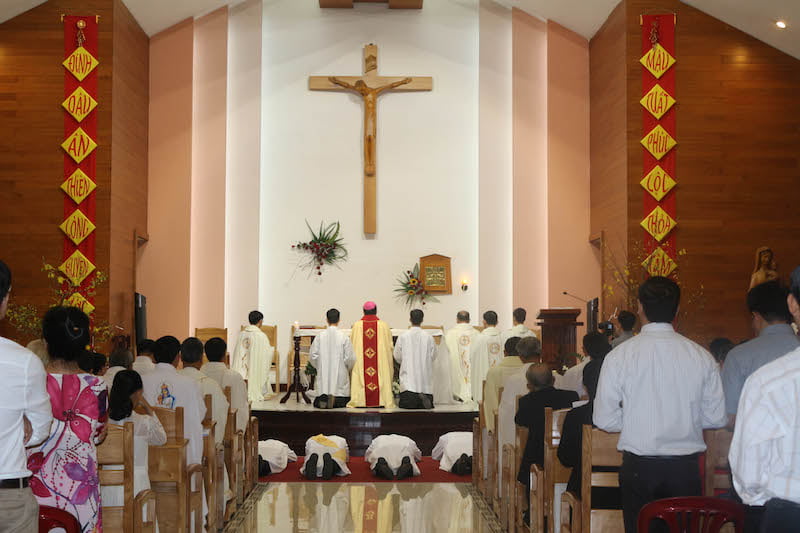 Rev. Francis Xavier Hoang Khac Luan, SJ, 39, was born in Tay Ninh province of Vietnam. He graduated from the Dentistry Faculty of Ho Chi Minh City Medicine and Pharmacy University. He joined the candidacy house of the Society of Jesus in 2005. After finishing the novitiate in 2009 in Thu Duc, Saigon, he studied philosophy at St. Joseph Jesuit Scholasticate. For regency, he was assigned to Laos as a missionary. In 2014, he began his theology studies at St. Joseph Jesuit Scholasticate in Saigon, Vietnam.Rev. Fr. Augustine Nguyen Minh Trieu, SJ, 36, is from the Daklak province of Vietnam. He studied Economics at Nong Lam University - Ho Chi Minh City, Saigon, Vietnam. In 2006 he joined the candidacy house of the Society of Jesus and in 2007 entered the Sacred Heart Novitiate in Thu Duc, Saigon. He studied philosophy at St. Joseph Jesuit Scholasticate in Saigon, Vietnam. After three years of studying philosophy, Trieu did his regency at Vatican Radio, Rome for two years. In 2014 he began his theology studies at Gregorian University in Rome and now he is serving as assistant to the Rector of the Saint Joseph Jesuit Scholasticate.Rev. Philip Tran Thanh Minh, SJ, 35, was born in Quang Nam province of Vietnam. He studied Laws at Ho Chi Minh City University of Law, Saigon, Vietnam. In 1999, he joined the candidacy house of the Society of Jesus, and was admitted to the Sacred Heart Novitiate in 2007. He studied philosophy and theology at St. Joseph Jesuit Scholasticate in Saigon, Vietnam. For regency, he was assigned as assistant to the director of Alberto Hurtado Center for social and apostolic work of the Vietnam Province, and as minister of St. Ignatius Community. Now he is finishing his theology studies at St. Joseph Jesuit Scholasticate.Rev. Peter Nguyen Duc Thang, SJ, 35, is from Dong Nai province of Vietnam. He studied English for office management at Ho Chi Minh City University of Foreign Languages – Information Technology, Saigon, Vietnam. In 2000 he joined the candidacy house of the Society of Jesus and was admitted to the Sacred Heart Novitiate in 2006. After his philosophy studies, he was assigned to the Catholic student ministry for his regency in Da Lat and Da Nang. In 2013 he began his theology studies at St. Joseph Jesuit Scholasticate. Since 2017 he has been missioned to Korean Province for social ministry and migrant services.At the end of the Mass, Bishop Joseph expressed his appreciation and gratitude for the service of the Jesuits in Vietnam. He invited the Vietnamese Jesuits not only to continue their missions but also to prepare for universal missions in different cultures and peoples for the greater glory of God. With this ordination, the Vietnamese Province of the Society of Jesus now has 79 priests and 5 deacons.Click here to see more photosChinh Tran, SJ