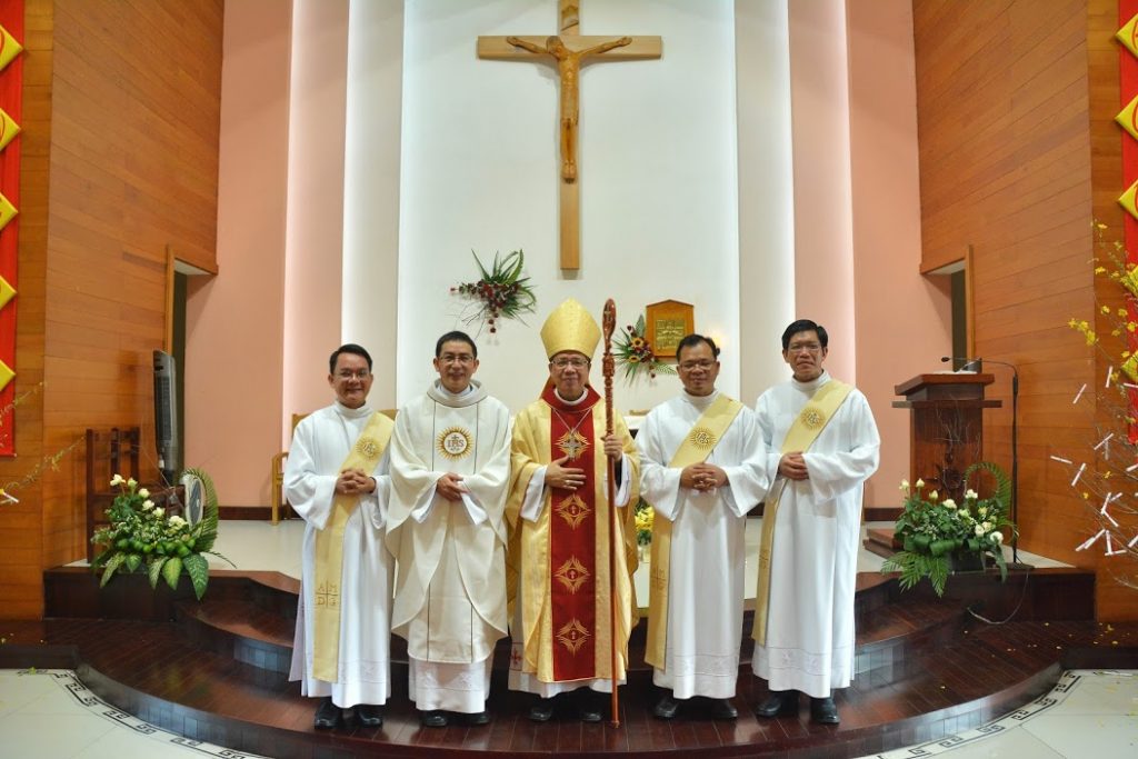 Bishop Joseph Do Manh Hung, posed with the newly-ordained deacons and priest after the mass and ordination rites at St Joseph Jesuit Scholasticate’s chapel.